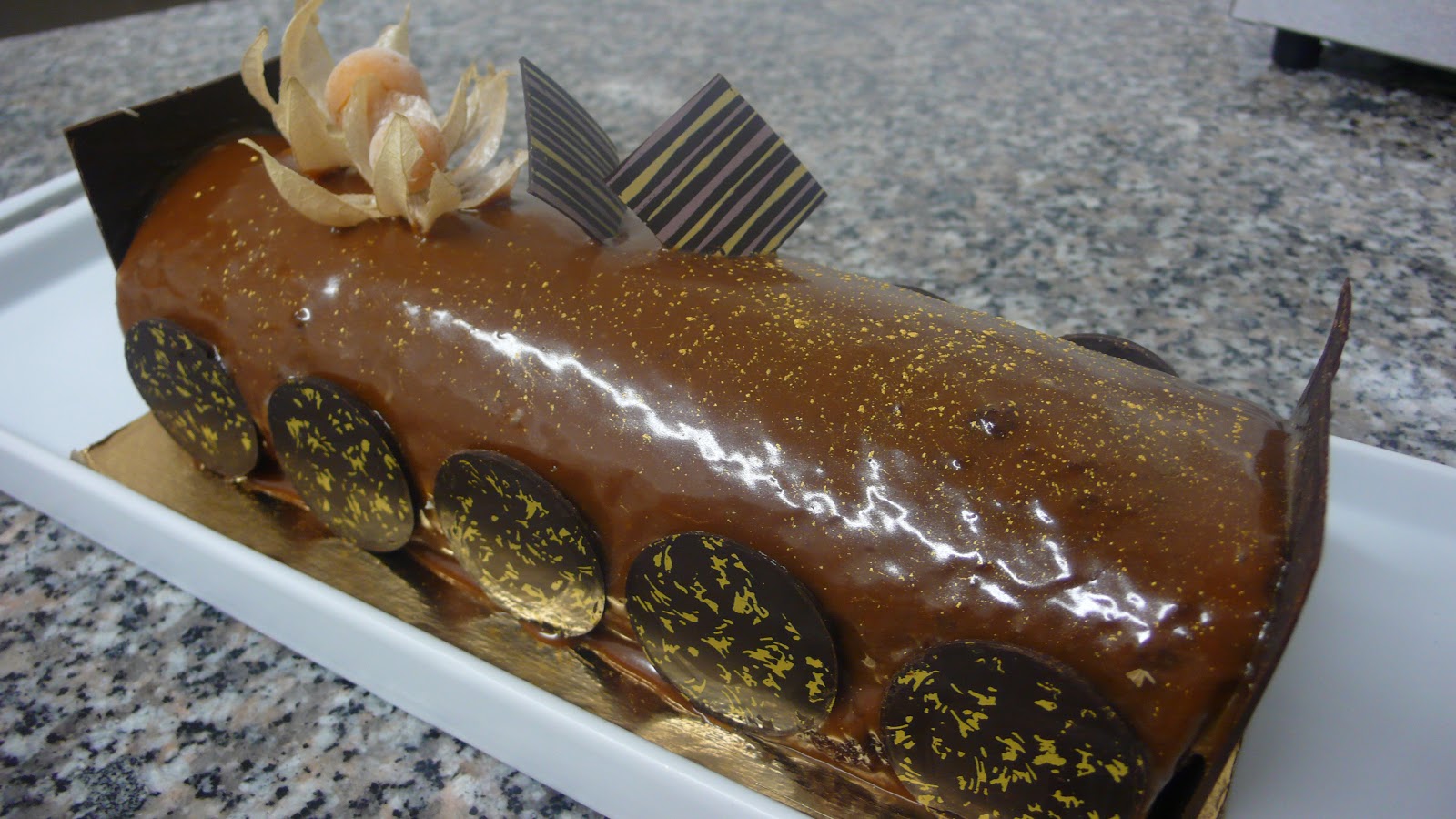 Cuire le sucre, le glucose et l’eau: façon caramel, sans mélanger!!! Pendant ce temps les feuilles de gélatine ramollissent dans de l’eau froide. Quand le caramel « fume » et qu’il a une couleur brun claire, décuire avec la crème, remettre à bouillir: première ébullition, stoppez dans un cul de poule froid et ajoutez la gélatine et la couverture lait. Mélangez pour obtenir un glaçage caramel. Utilisez à 32°c- 35°c, glacez la bûche posée sur une grille (pour laisser tomber l’excédant) et décorez de votre choix.