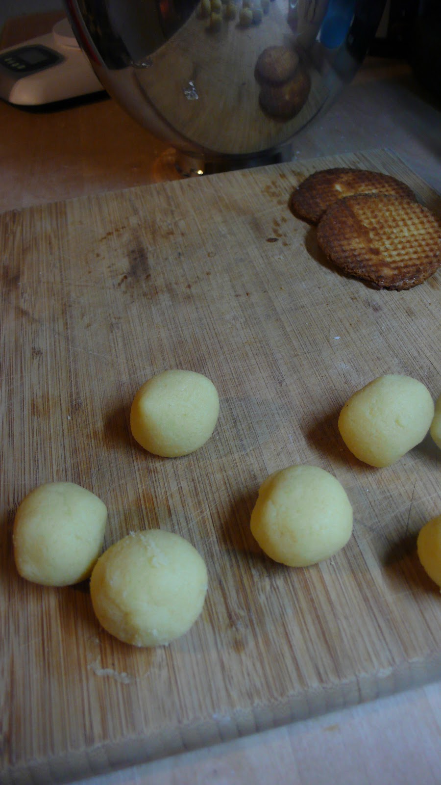 Liez avec l’oeuf et le lait. Confectionnez des boules de 25g!